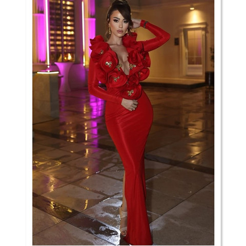 เดรสงานพรอมเซ็กซี่แขนยาวประดับด้วยลูกปัดสำหรับงานปาร์ตี้กลางคืนกลางคืน